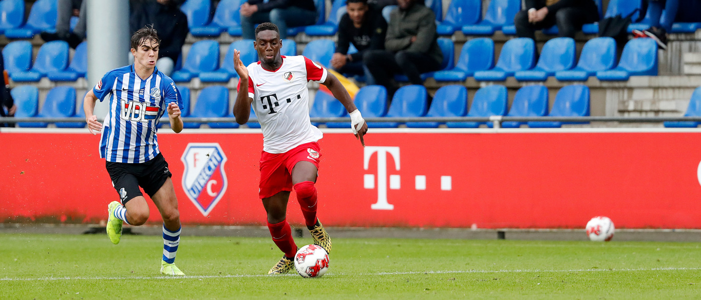 Maak je zelf de kansen niet af, dan krijg je de vloek dat de eerste beste kans van de tegenpartij er direct in gaat. En dat is precies wat er vanavond gebeurt. De beloftenploeg van FC Utrecht beleeft een sterke openingsfase, maar het zijn de Eindhovenaren die vanavond de score openen. Kaj de Rooij stoomt na tien minuten op aan de linkerflank. De vleugelspeler dribbelt richting het zestienmetergebied en schuift bal vervolgens achter doelman Fabian de Keijzer: 0-1.
