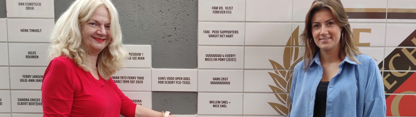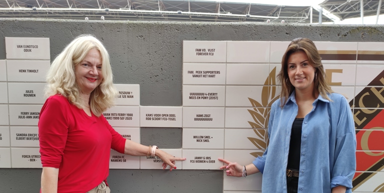 Janny & Iris, FCU WOMEN 4 EVER. Zo luidt de naam die op de tegel te bewonderen is, en Janny licht toe: “Ik kreeg een tip voor een naam die heel erg van toepassing is op ons. Wij blijven ons cluppie trouw, in goede maar ook zeker in slechte tijden, daar is geen enkele twijfel over.”