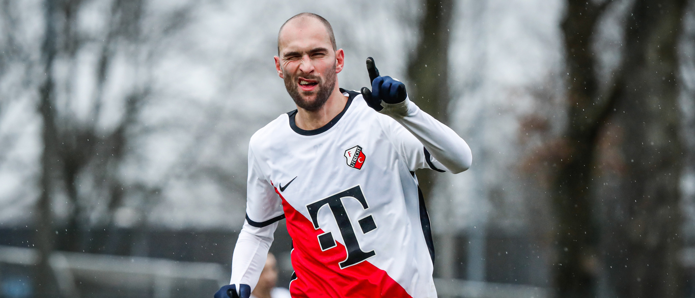 Dat doet overigens niet alleen Booth. Ook Sander van de Streek laat herhaaldelijk van zich spreken en met een snoeihard schot dat recht op de kruising afgaat doet ook Can Bozdogan een duit in het Utrechtse kansenzakje. De middenvelder ziet zijn poging gekeerd worden door Vaessen, wiens collega Fabian de Keijzer aan de overkant van het veld beduidend minder vaak op de proef wordt gesteld. De goalie van de Utrechters komt door pogingen van Pelle Clement en Lars Nieuwpoort niet in de problemen.