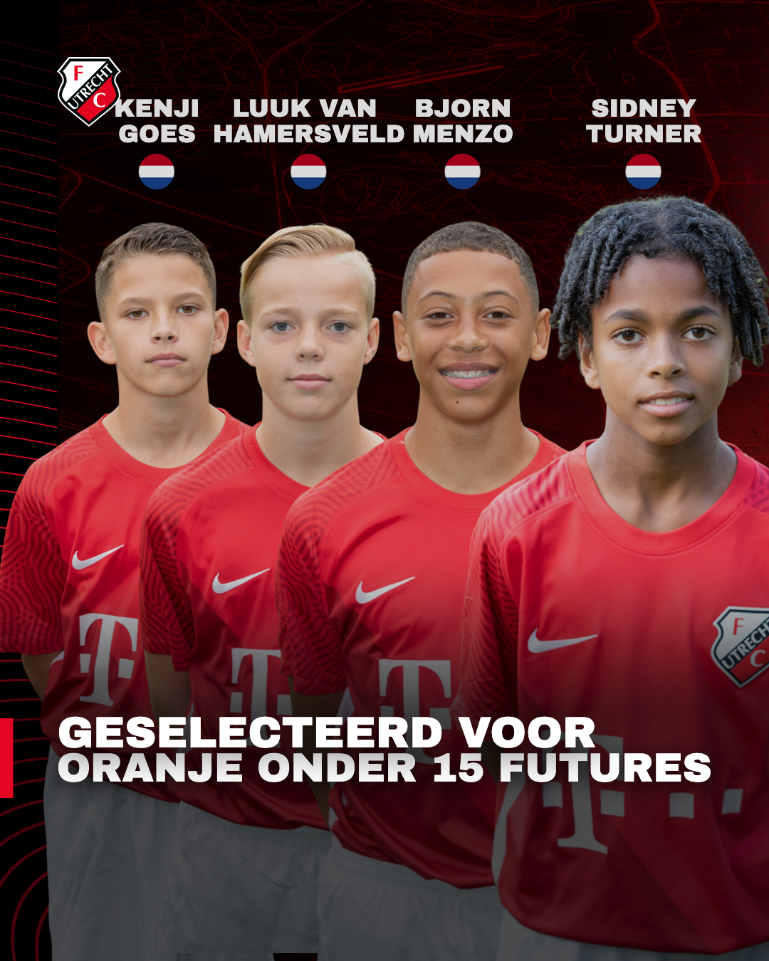 FC Utrecht is, samen met AZ, hofleverancier van Oranje Onder 15 Futures. Voor dat team zijn door bondscoach Maurice Hagebeuk vier FC Utrecht-talenten opgeroepen. Bjorn Menzo, Kenji Goes, Luuk van Hamersveld (foto) en Sidney Turner behoren tot de 35-koppige selectie.