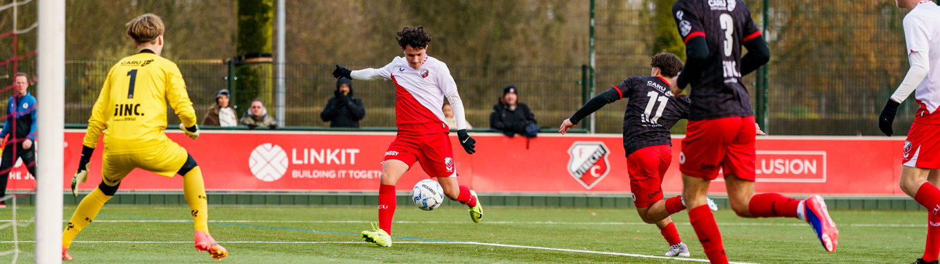 De wedstrijd startte onder herfstachtige omstandigheden waarbij de regenboog ook nog even meekeek bij de wedstrijd. In de 7de minuut een aanval over links waarbij Dylan de bal goed voorgaf in de 16 maar er werd niet gescoord. In de 12de minuut een uitbraak van Excelsior O16, de bal kwam voor en een goed schot maar Mike wist de bal uit zijn goal te houden. In de volgende tegenaanval gaf Rayan de bal voor op Miles, die haalde uit en de bal vloog links van de keeper de goal in, 1-0 voor FC Utrecht O16. De boys van O16 hebben moeite om door Excelsior O16 heen te spelen, richting het einde van de eerste helft kwam een bal door het midden bij Daeley terecht die de keeper omzeilde maar de bal werd van de lijn gehaald.