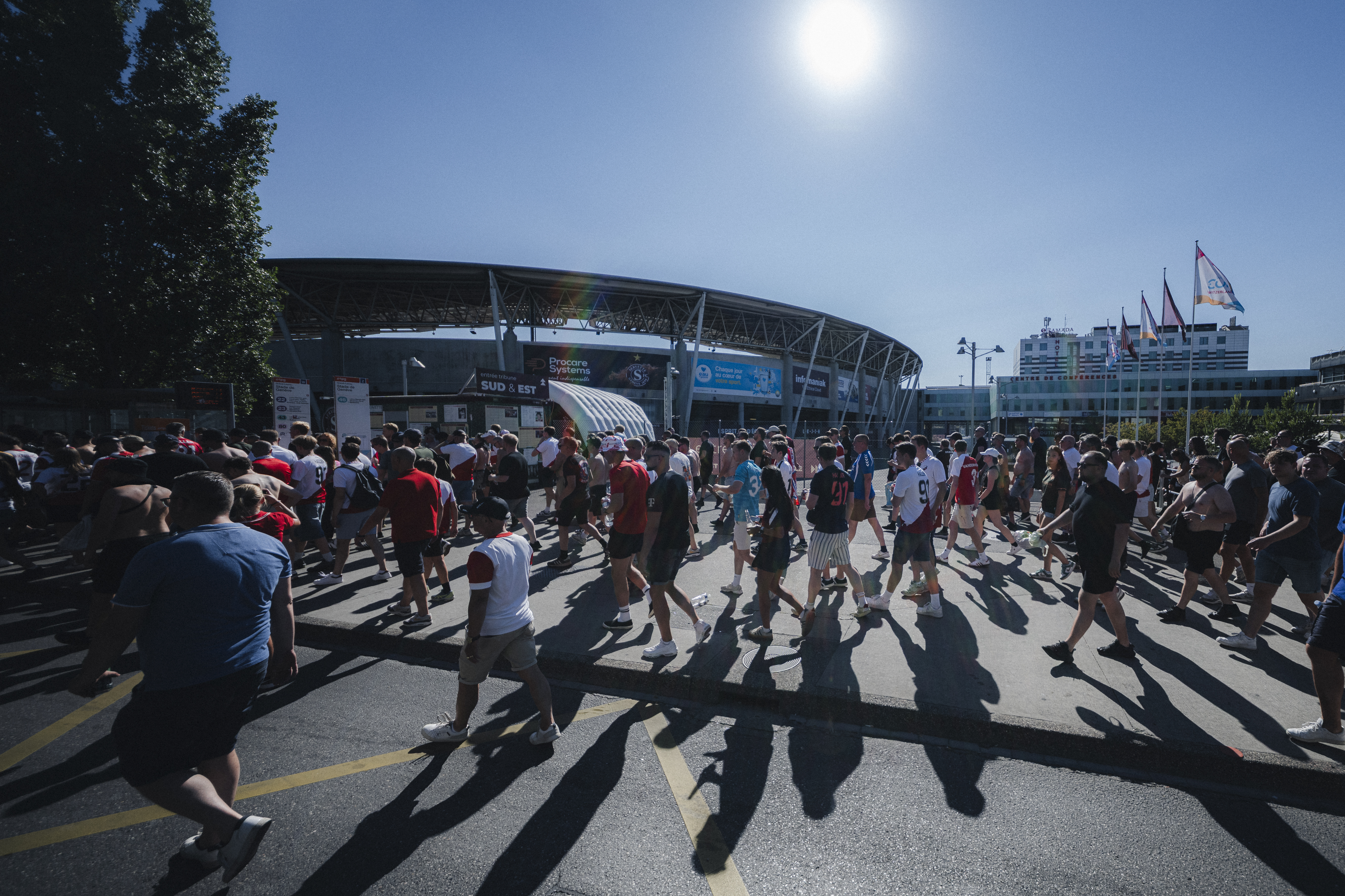 Vanaf deze plek begint een bijzondere tocht: de fanwalk. Onder begeleiding van de SLO’s en stewards van FC Utrecht loopt een stoet van naar schatting zeventienhonderd supporters in rood-wit vanaf de Plaine de Plainpalais naar het Stade de Genève – een wandeling van 2,7 kilometer.