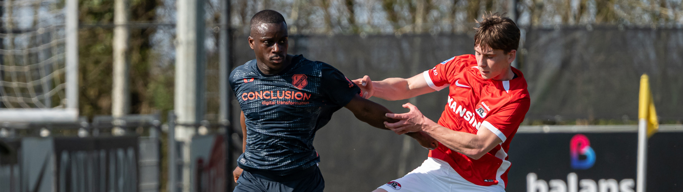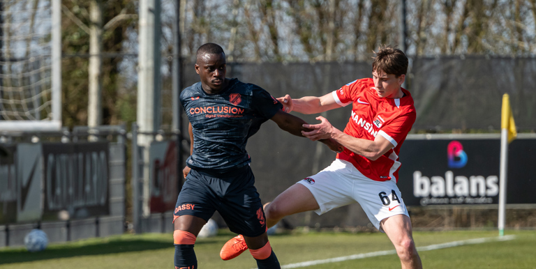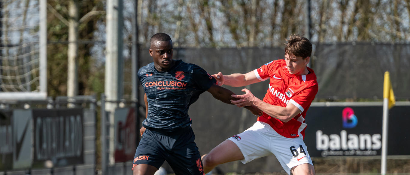 Op een zonovergoten donderdagmiddag op het AFAS Trainingscomplex hebben de Alkmaarders niet lang nodig om de ban te breken. Mexx Meerdink benutte een voorzet slim met een hakbal achter zijn standbeen: 1-0. In het restant van de eerste helft golft het spel op en neer en zijn beide ploegen aan elkaar gewaagd.